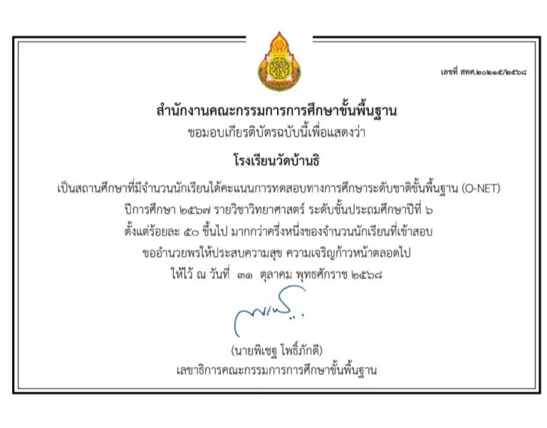 กิจกรรม โรงเรียนวัดบ้านธิ ได้รับเกียรติบัตรสถานศึกษาที่มีจำนวนนักเรียนได้คะแนนการทดสอบการศึกษาระดับชาติขั้นพื้นฐาน o-net ป.6 ปีการศึกษา 256711/01/202611/01/2026